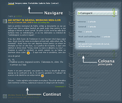 Arata bine, dpdv al designului este relativ bine gandit, dar accesibilitatea lasa de dorit, cat si usurinta navigarii. Spun “relativ bine” pentru ca design-ul in primul rand nu trebuie sa arate bine, ci sa faciliteze transmiterea unor informatii sau comunicarea dintre autor si audienta. Si este un pic cam greu de realizat acest lucru cu un layout atat de nonconformist.